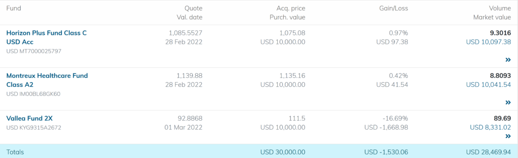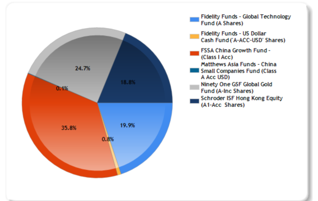 変更後のPFはざっくりチャイナグロース40%、グローバルテクノロジー20%、グローバル金鉱株20%、香港株20%