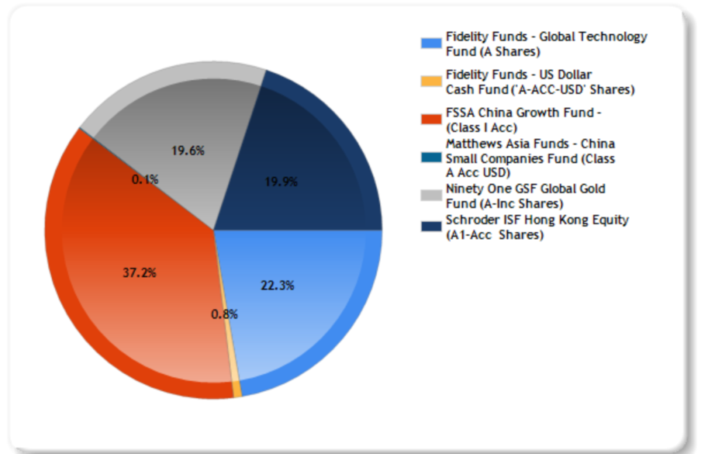 変更後のPFはざっくりチャイナグロース40%、グローバルテクノロジー20%、グローバル金鉱株20%、香港株20%