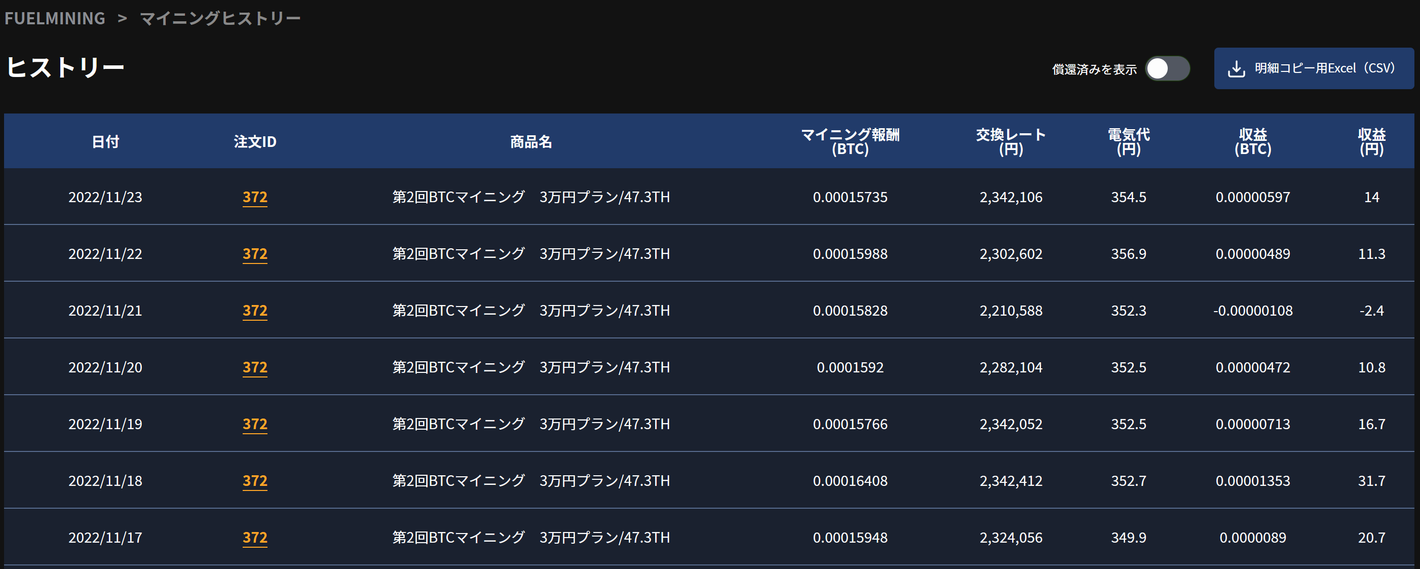 さて2オーダー、税込み8470円支払いのマイニング償還が終わりました。