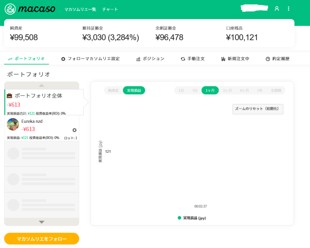 マカソムリエ名 累積利益 (直近7日間:損益 勝数/トレード数 平均時間)