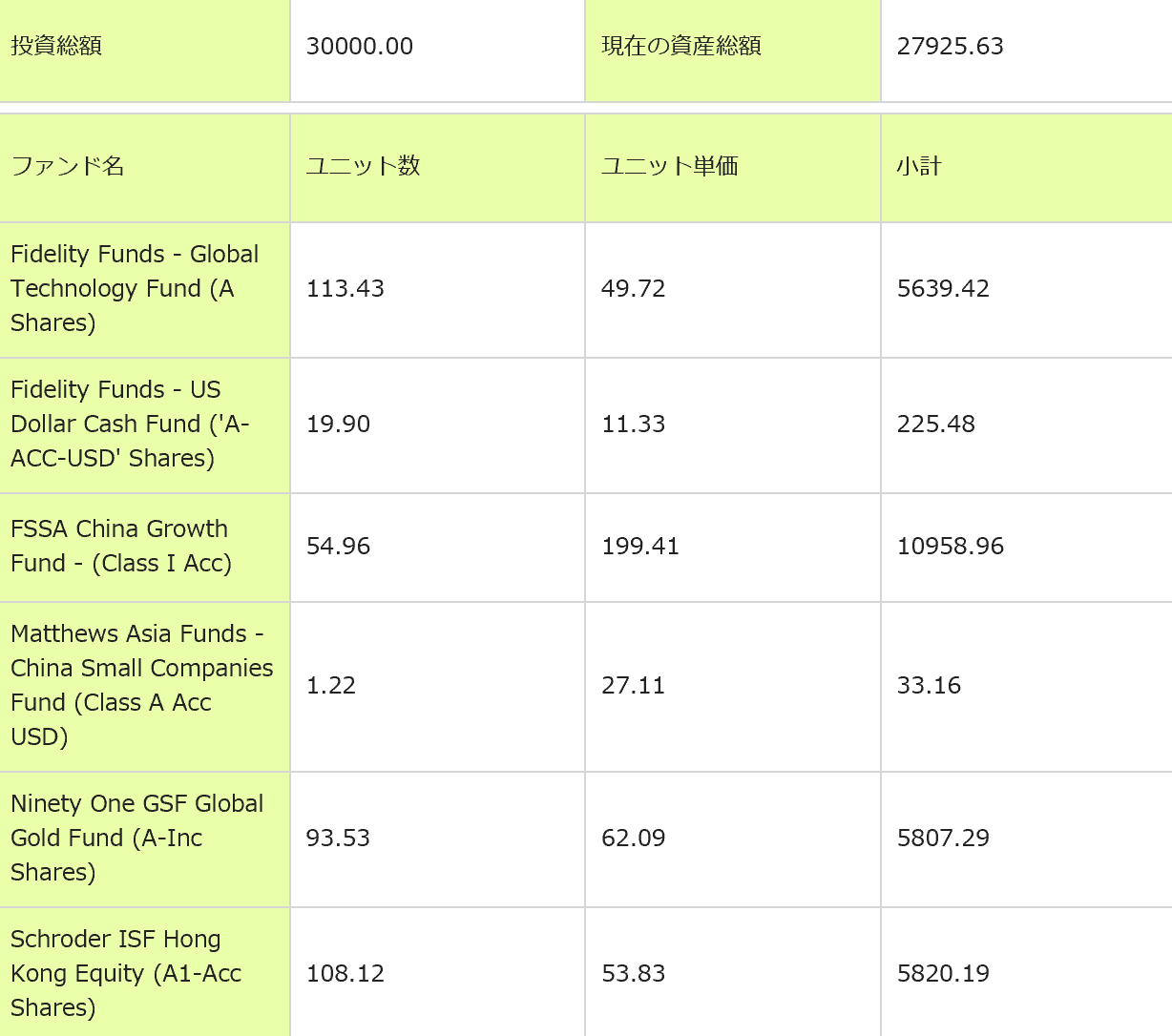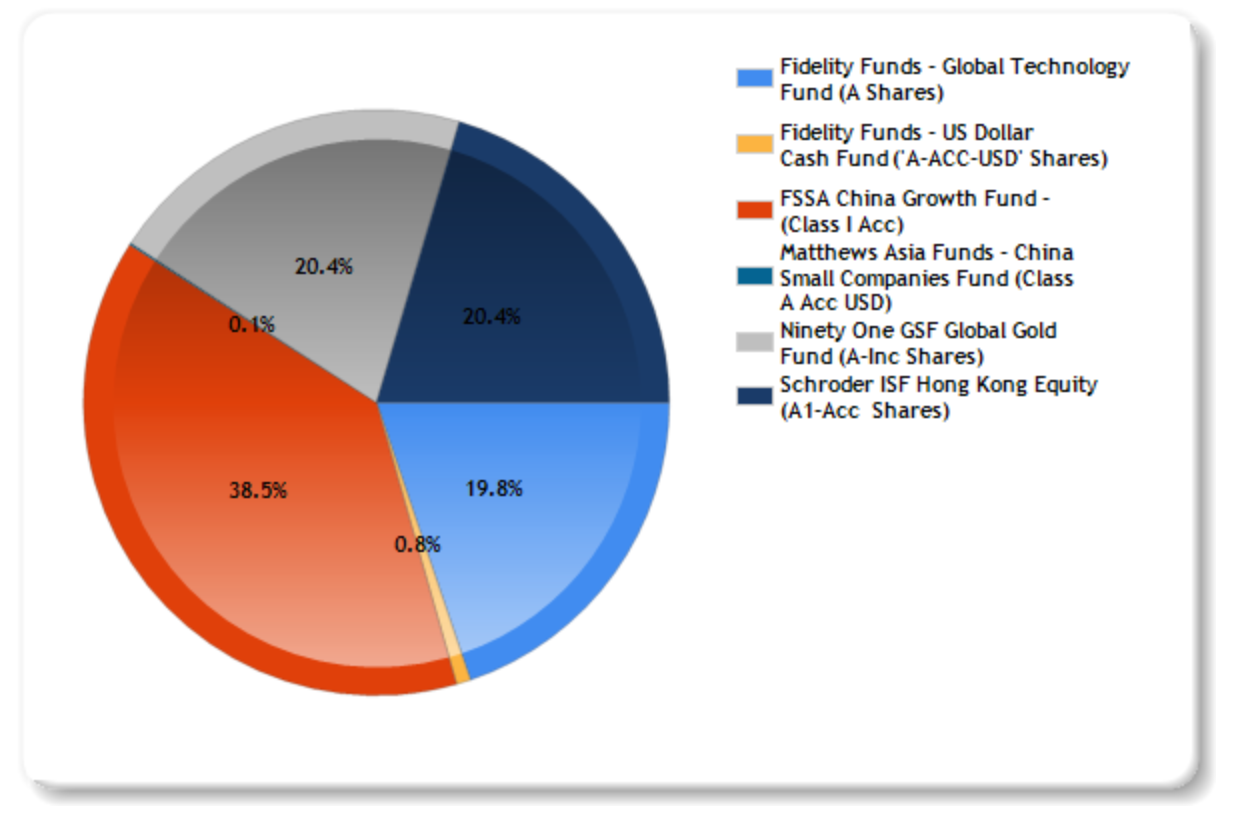 変更後のPFはざっくりチャイナグロース40%、グローバルテクノロジー20%、グローバル金鉱株20%、香港株20%