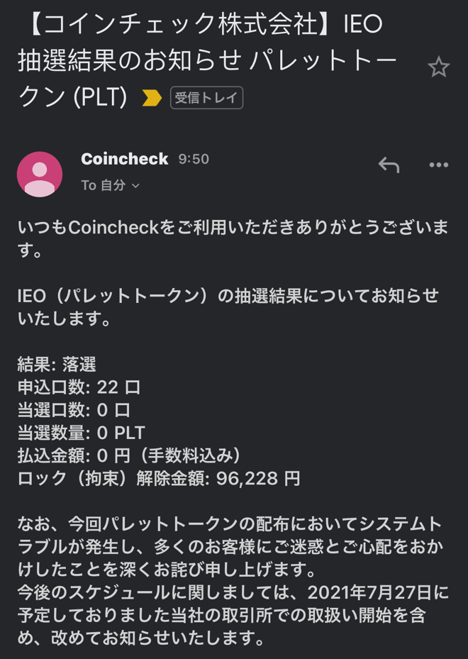 以前紹介したコインチェックの日本発IEO案件。大人気になり割当0の結果でした。
