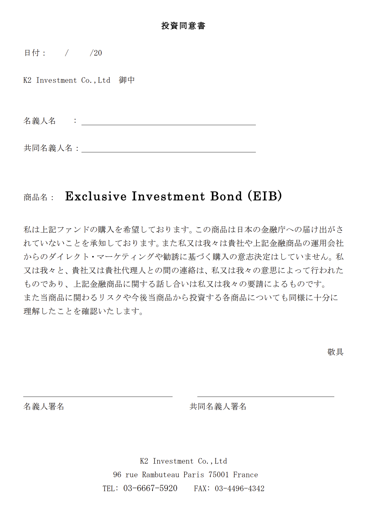 K2からはEIBの口座開設に関する書類関係の連絡が来ていて、その中に下記の【投資同意書】がありました。
