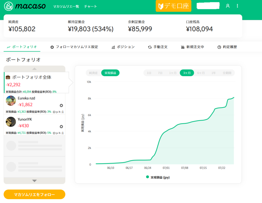 マカソムリエ名 累積利益 (直近7日間:損益 勝数/トレード数 平均時間)
