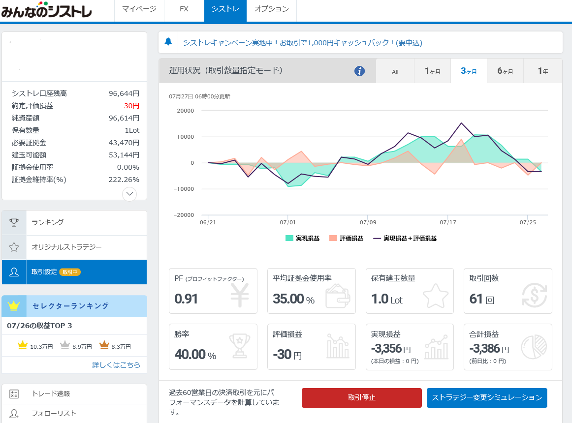 さっそく6/24から開始しました!3週間終了しての結果がこちら。※10万円、1Lot