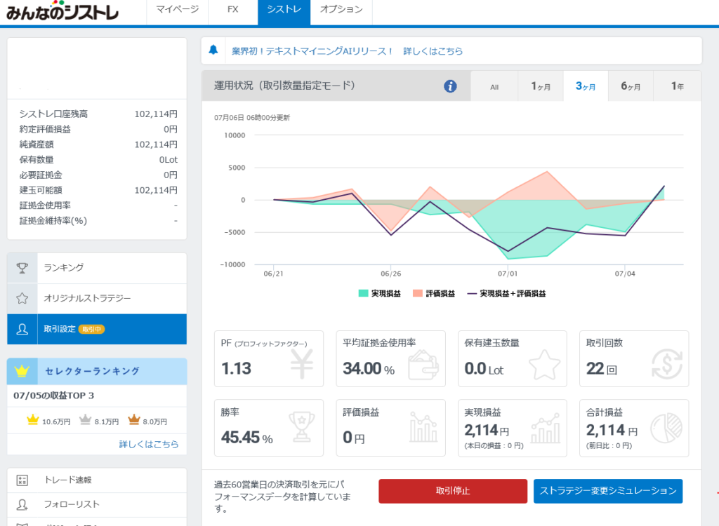 さっそく6/24から開始しました!2週間終了しての結果がこちら。※10万円、1Lot