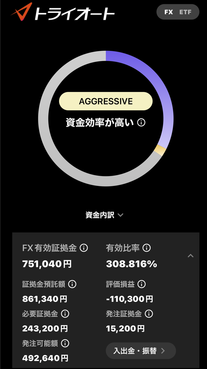表示デザインがちょっと変わりましたが、資金効率が高い=リスク取りすぎとも読めますね。