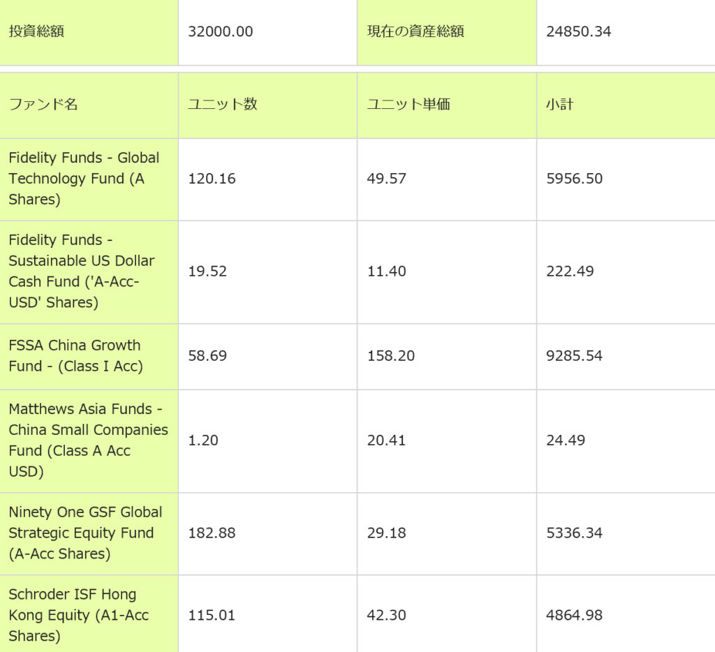 変更後のPFはざっくりチャイナグロース40%、グローバルテクノロジー20%、グローバル金鉱株20%、香港株20%