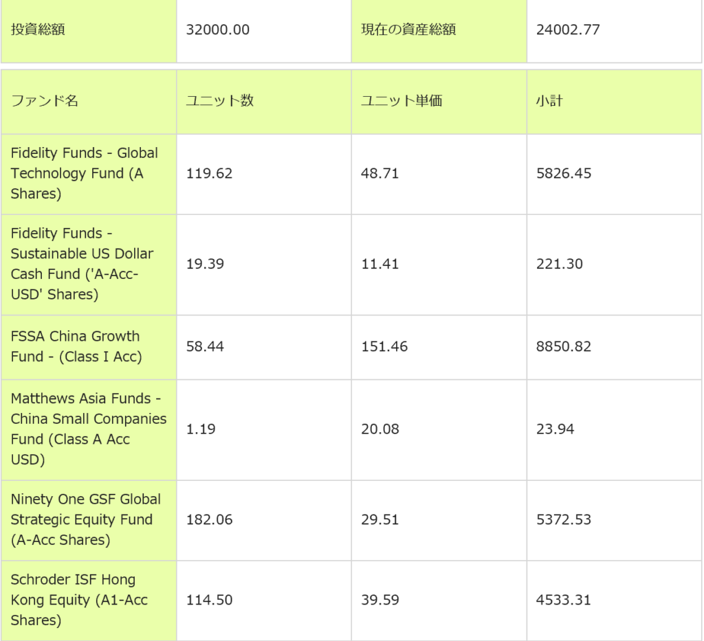 変更後のPFはざっくりチャイナグロース40%、グローバルテクノロジー20%、グローバル金鉱株20%、香港株20%