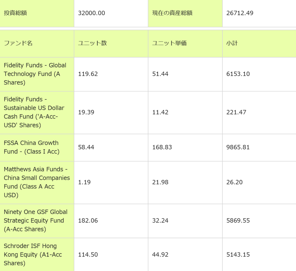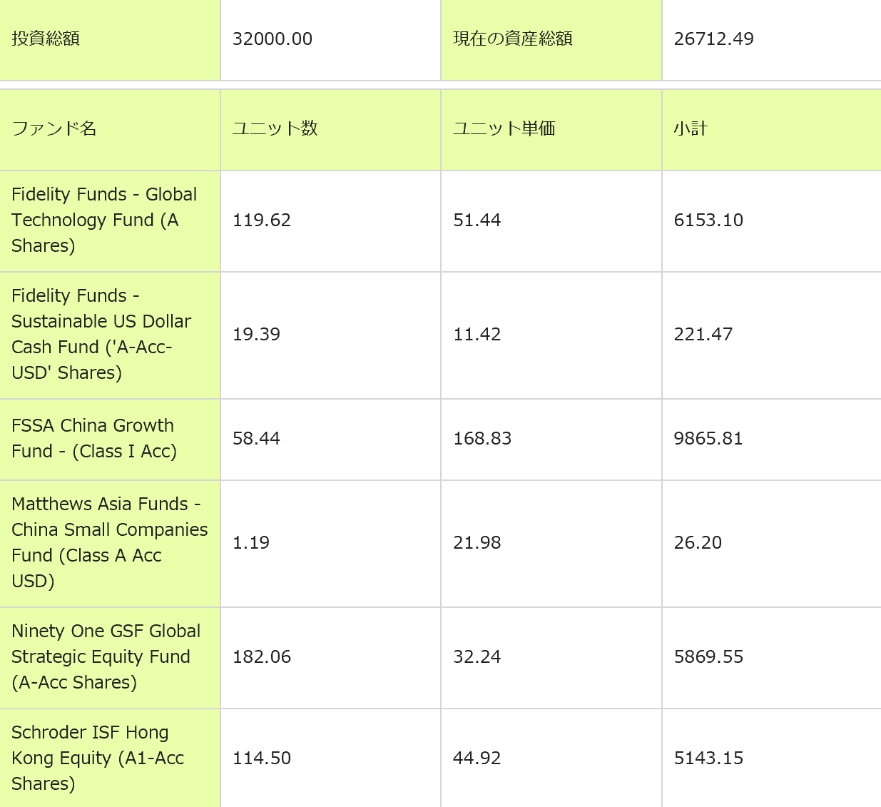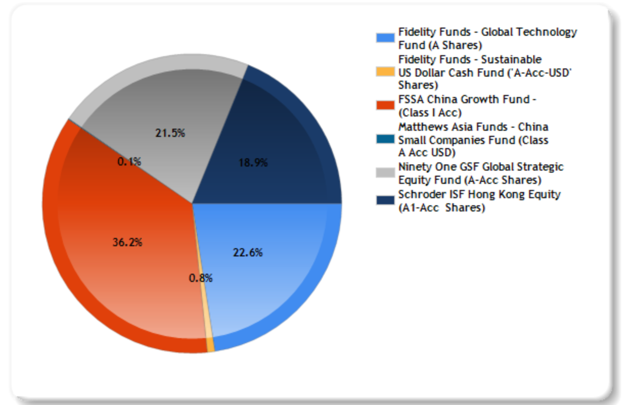 変更後のPFはざっくりチャイナグロース40%、グローバルテクノロジー20%、グローバル金鉱株20%、香港株20%