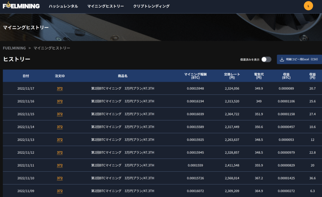 さて2オーダー、税込み8470円支払いのマイニング償還が終わりました。