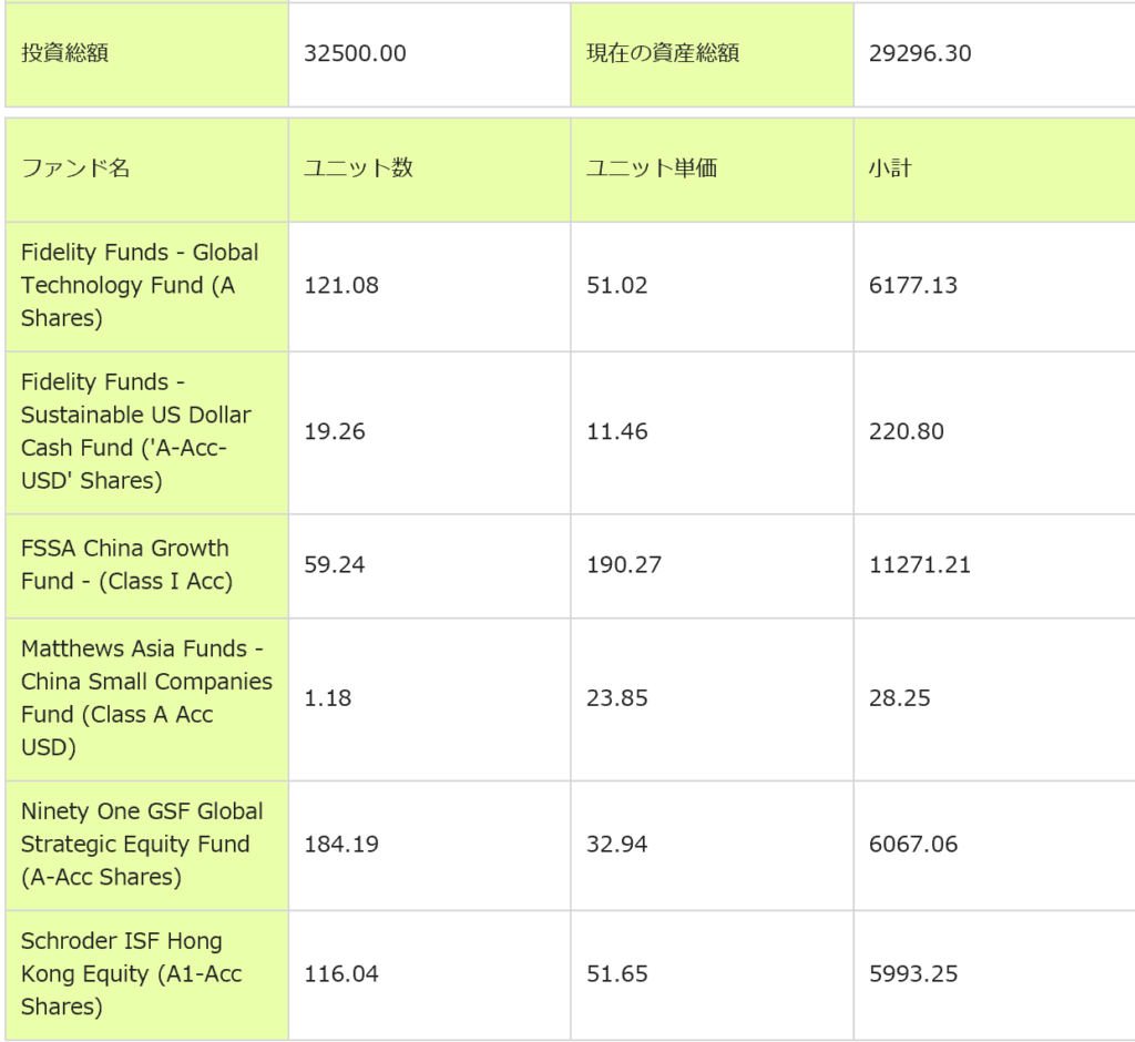 変更後のPFはざっくりチャイナグロース40%、グローバルテクノロジー20%、グローバル金鉱株20%、香港株20%