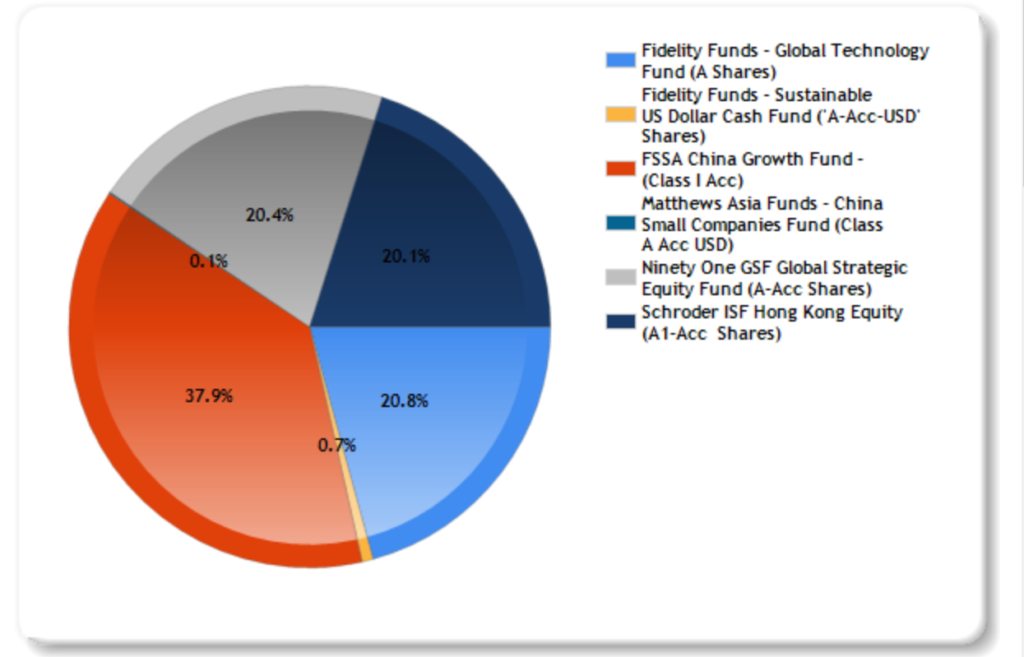 変更後のPFはざっくりチャイナグロース40%、グローバルテクノロジー20%、グローバル金鉱株20%、香港株20%