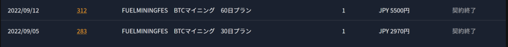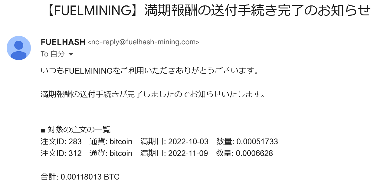 さて2オーダー、税込み8470円支払いのマイニング償還が終わりました。