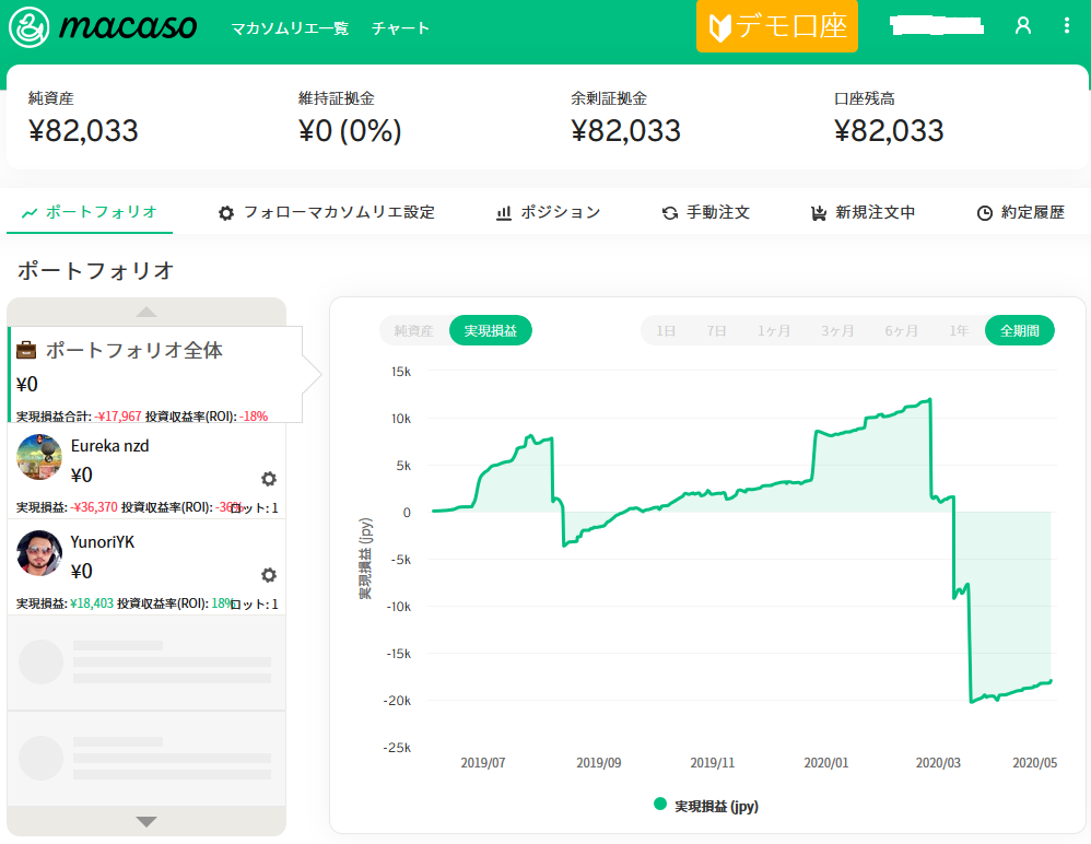 マカソムリエ名 累積利益 (直近7日間:損益 勝数/トレード数 平均時間)