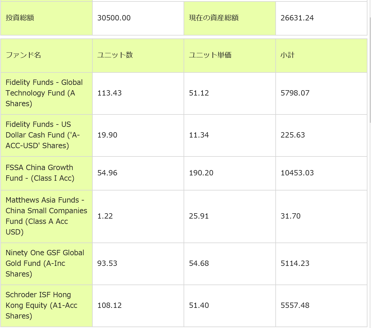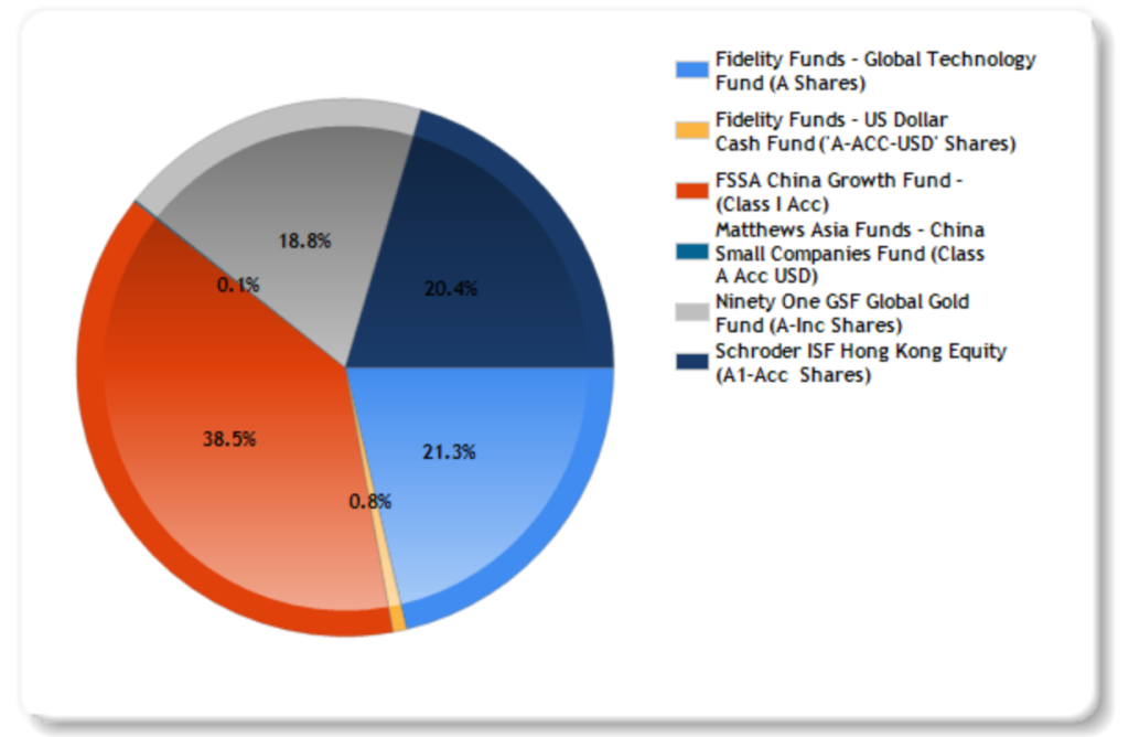 変更後のPFはざっくりチャイナグロース40%、グローバルテクノロジー20%、グローバル金鉱株20%、香港株20%