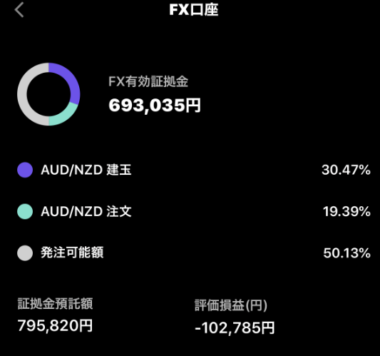 2口座で原資合計30万ほど入金して証拠金維持率を2000-4000%程度で耐えています。